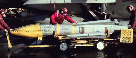 Artificieros de un portaaviones colocando en posición un AIM-54C para ser cargado en un Tomcat. Solo este avión podía usarlo. Obsérvese el gran tamaño del mismo, necesario para cargar un buen radar y el combustible suficiente para lograr su alcance máximo, de casi 200 km.